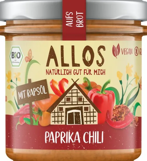 Cremig-würziger Brotaufstrich mit Paprika und Chili aus dem Hause Allos – ideal auch zu Salaten, Pasta oder als Dip.