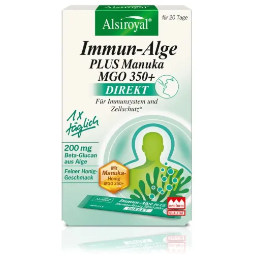 Gerade in Zeiten erhöhter Belastung durch Viren und Bakterien ist das Immunsystem besonders gefordert. Alsiroyal® Immun-Alge PLUS Manuka MGO 350+ DIREKT bietet gezielte Unterstützung durch eine effektive Kombination aus Vitamin C und Zink*, ergänzt mit hochwertigem Manuka-Honig MGO 350+ und wertvollen Beta-Glucanen aus der Mikroalge Euglena gracilis.