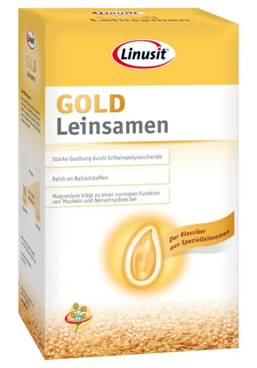 | Lager- und Aufbewahrungshinweise | Verzehrsempfehlung : 3 x täglich möglichst vor oder zum Essen verzehren. Bitte achten Sie auf eine reichliche Flüssigkeitszufuhr pro Tag. Als pure Variante: 1. Je 15 g GOLD Leinsamen (2 Esslöffel). Für Kinder von 6-12 Jahren nur 1 Esslöffel. 2. Möglichst unzerkaut verzehren. 3. 1-2 Gläser Wasser (mindestens 15 ml) nachtrinken. Als Leinsamenbrei: 1. 15 g GOLD Leinsamen (2 Esslöffel) in ca. 400 ml Wasser einrühren und kurz aufkochen. 2. Ab und zu umrühren und bis zu 1 Stunde quellen lassen. 3. Anschließend mit Samen verzehren. Als Leinsamengel: 1. 15 g GOLD Leinsamen (2 Esslöffel) mittels Teigrolle oder Ähnlichem zunächst leicht anquetschen (nicht schroten!). 2. In ca. 400 ml Wasser einrühren und kurz aufkochen. 3. Ab und zu umrühren und bis zu 1 Stunde quellen lassen. 4. Grob über ein Sieb streichen und Leinsamengel innerhalb von 30 Minuten verzehren. |