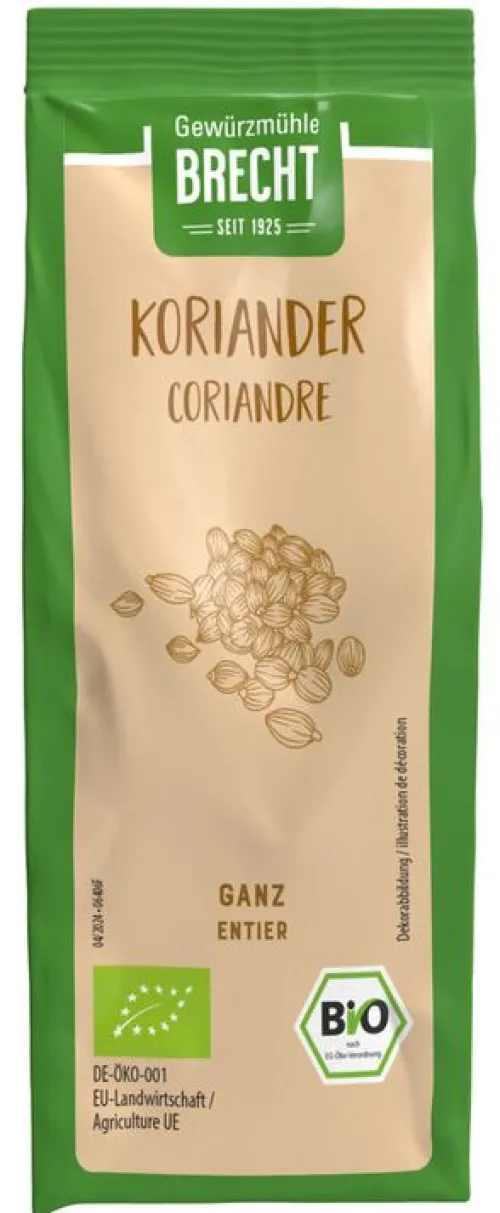 Der ganze Koriander von Brecht verleiht Ihren Gerichten eine unverwechselbar-würzige Note. Sorgfältig aus kontrolliert biologischem Anbau geerntet, bewahren die Samen ihr volles Aroma.