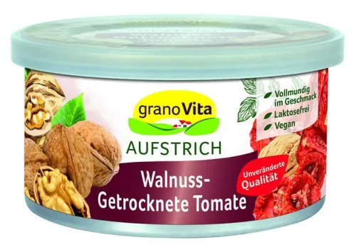 Wasser, Nährhefe, 7% WALNÜSSE, Palmkernfett, Kartoffelpulver, Zwiebeln, 5% getrocknete Tomaten, Palmfett, Olivenöl, Tomatenmark, Meersalz, Agavensirup, getrocknete Zwiebeln, Sonnenblumenkerne, Oregano, Paprika, Farbstoff Paprikaextrakt, Thymian, Knoblauch, Pfeffer. enthält folgende allergene Zutaten: Schalenfrüchte