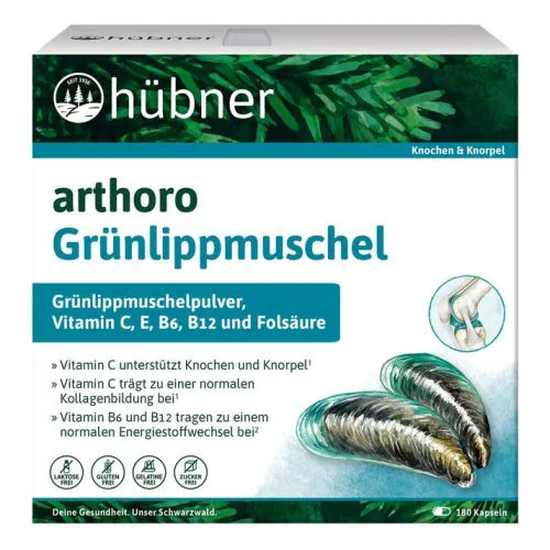 Hübner Arthoro Grünlippmuschel vereint hochwertiges Grünlippmuschelpulver aus Neuseeland mit sorgfältig abgestimmten Vitaminen. Der Muschelextrakt macht dabei 70 % der Zusammensetzung aus und wird durch Vitamin C, Vitamin E sowie die Vitamine B6, B12 und Folsäure ergänzt. Vitamin C trägt zur normalen Kollagenbildung für eine normale Funktion von Knochen und Knorpel bei, während Vitamin E dazu beiträgt, die Zellen vor oxidativem Stress zu schützen.