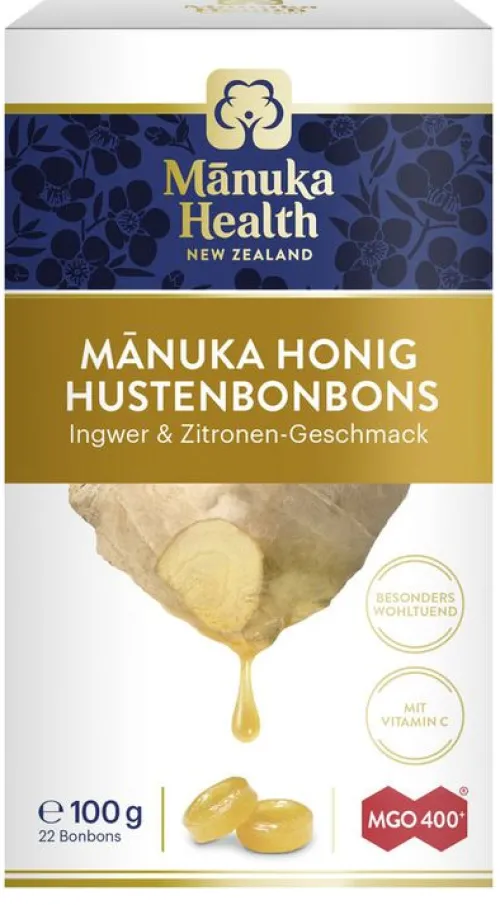 Rohrzucker, Glukosesirup, MGO™400+ Manuka Honig (Leptospermum scoparium, 8%), Wasser, Ingwerextrakt, Zitronenöl, Vitamin C.