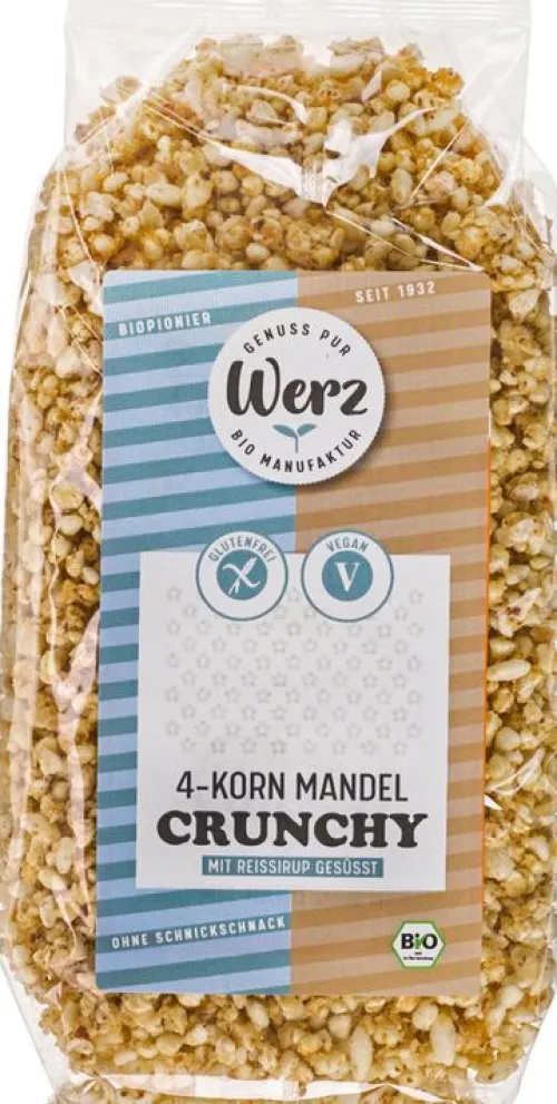 Fehlt etwas Crunchiges zum Müsli? Probiere jetzt das glutenfreie 4-Korn Mandel Crunchy in bester Bio-Qualität von Werz.