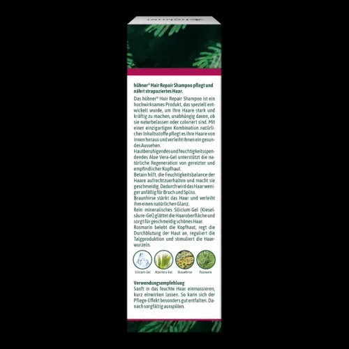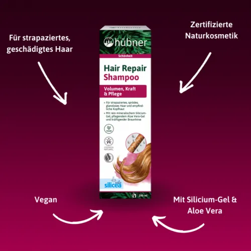 Zertifizierte, vegane Naturkosmetik, ideal für beanspruchtes und beschädigtes Haar, besteht aus reinem mineralischem Kieselsäure-Gel, nährendem Aloe-Vera-Gel und stärkender Braunhirse. Früher als Hübner Original silicea® Hair Repair Shampoo bekannt.