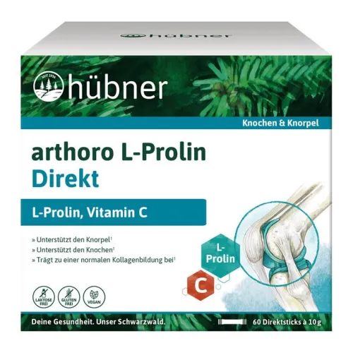 Täglich 2 x 1 Direktstick hübner® arthoro L-Prolin Direkt Pulver in einem Glas Wasser (100–200 ml) auflösen und trinken.