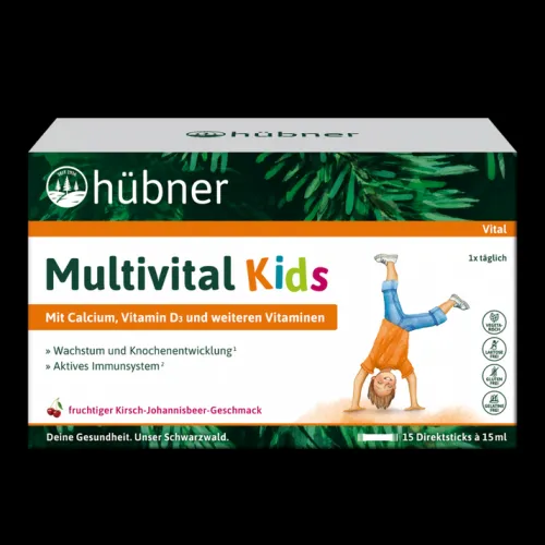 Hübner Multivital Kids bietet ein Nahrungsergänzungsmittel mit 14 wichtigen Nährstoffen, die für eine gesunde Entwicklung im Kindesalter essentiell sind.