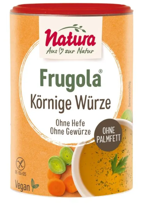 Frugola Körnige Würze ist eine seit Jahrzehnten bekannte und bewährte Speisewürze mit ungehärtetem Pflanzenfett zum Würzen und Abschmecken von Suppen, Eintöpfen, Gemüsen, (Getreide-)Speisen und Soßen.
