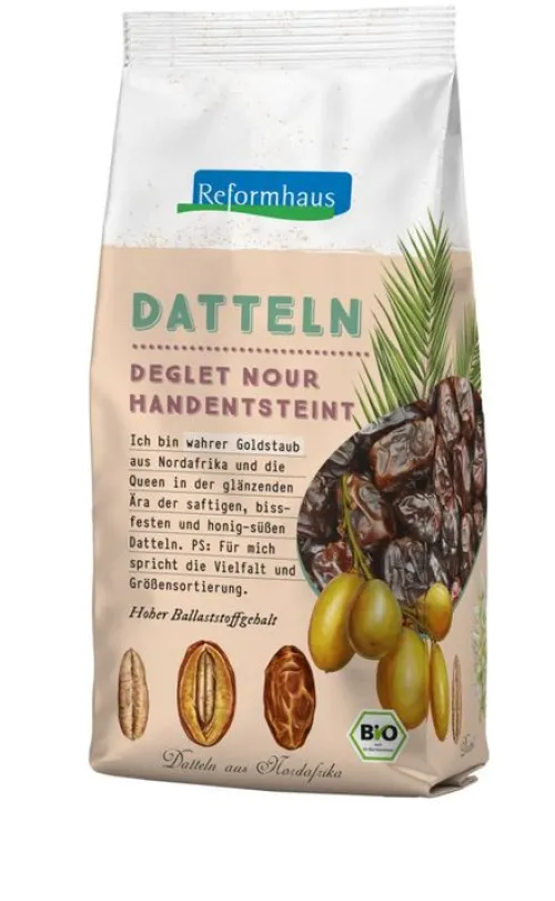 Reformhaus Datteln sind ein einzigartiges Geschmackserlebnis für große und kleine Genießer. Aufgrund des fruchteigenen Zuckers sowie der Mineralien Kalium, Magnesium und Eisen sind sie ein honigsüß-aromatischer und besonders gesunder Energielieferant.