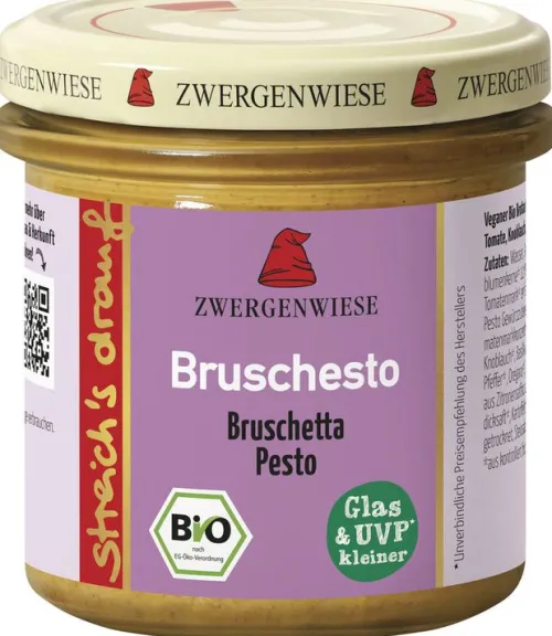 Der Zwergenwiese „streich’s drauf Bruschesto“ ist ein veganer Bio-Brotaufstrich mit aromatischen Tomaten, feinem Knoblauch und mediterranem Oregano – inspiriert von klassischem Bruschetta-Geschmack. Hergestellt in Deutschland aus ökologischen Zutaten wie Sonnenblumenkernen, Tomaten und einem würzigen Pesto-Mix, bietet dieser Aufstrich ein vollmundiges Geschmackserlebnis. Die Kombination aus getrockneten Tomaten, Basilikum und einem Hauch Zitronensaft sorgt für eine fruchtig-würzige Note, die ideal aufs Brot, zu Ofengemüse oder als Dip passt.