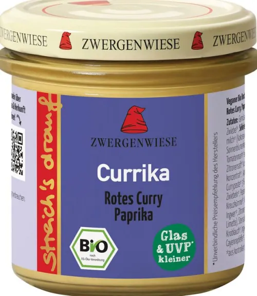 Der vegane Brotaufstrich „streich’s drauf Currika“ von Zwergenwiese vereint sonnengereiftes Gemüse wie Paprika, Zwiebeln und Sellerie mit aromatischer Kokosnussmilch und einer fein abgestimmten roten Currypaste. Sonnenblumenkerne und Rapsöl sorgen für eine cremige Textur, während Gewürze wie Kreuzkümmel, Ingwer und Koriander dem Aufstrich eine exotisch-würzige Tiefe verleihen. Alle Zutaten stammen aus kontrolliert biologischem Anbau und machen Currika zu einer besonderen Ergänzung auf Brot, Crackern oder als Dip zu Gemüse.